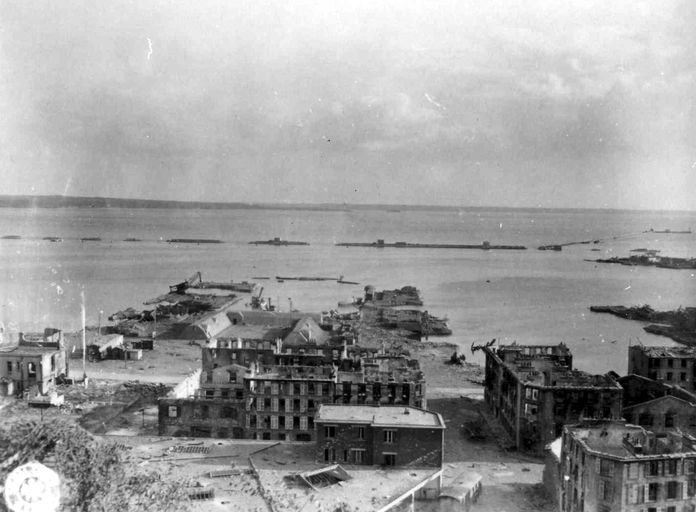 Vue de la festung Brest pendant la bataille de Brest, U.S. Army Signal Corps, septembre 1944 : immeubles détruits, digues du port et abris en béton du Port de Commerce (zone de transit des blessés vers Lanvéoc)Immatriculation