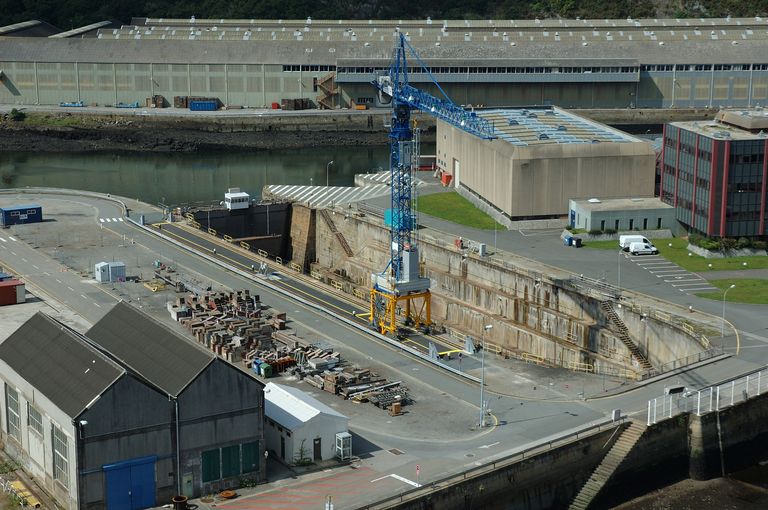 Vue d'ensemble des formes de construction, bassins de radoub actuellement bassins n° 4, 6 et 7 depuis le pont de l'Harteloire : bassin n° 7Immatriculation