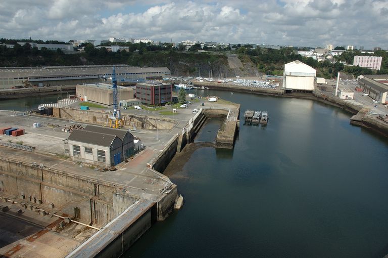 Vue d'ensemble des formes de construction, bassins de radoub actuellement bassins n° 4, 6 et 7 depuis le pont de l'Harteloire : bassin n° 6Immatriculation