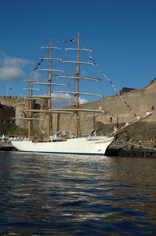 Vue de la Penfeld et du château lors des Fêtes maritimes de Brest 2008 (au ponton, Cisne Branco, clipper trois-mâts carré de la marine nationale brésilienne)Immatriculation