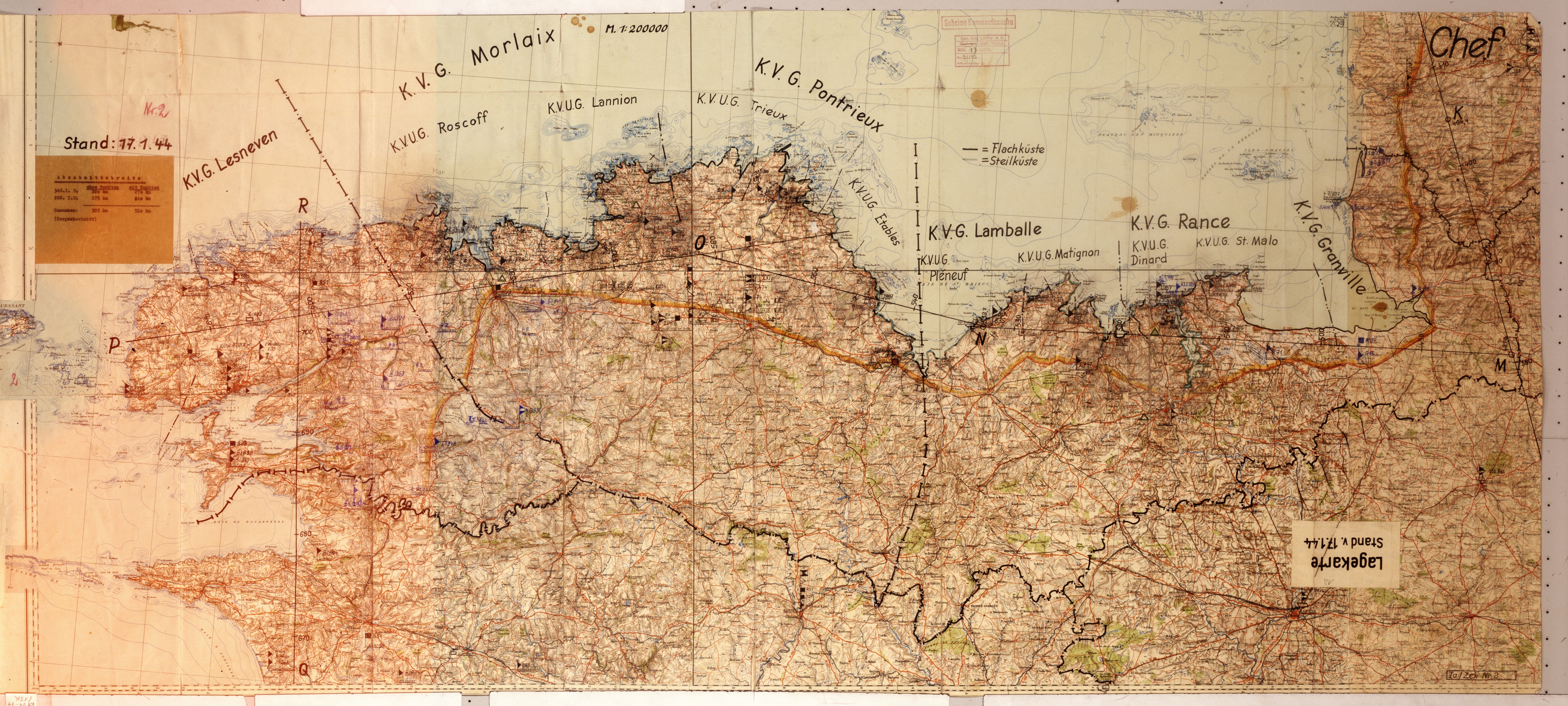 Carte de situation au 17 janvier 1944 des différents secteurs de défense côtiers (Küsten-Verteidigungs-Gruppe, en abrégé KVG) et de leurs sous-groupes (Küsten-Verteidigungs-Unter-Gruppe, en abrégé KVGU) et des garnisons en Bretagne Nord et dans la Manche. La carte précise la géographie des côtes : plates ou falaisesImmatriculation