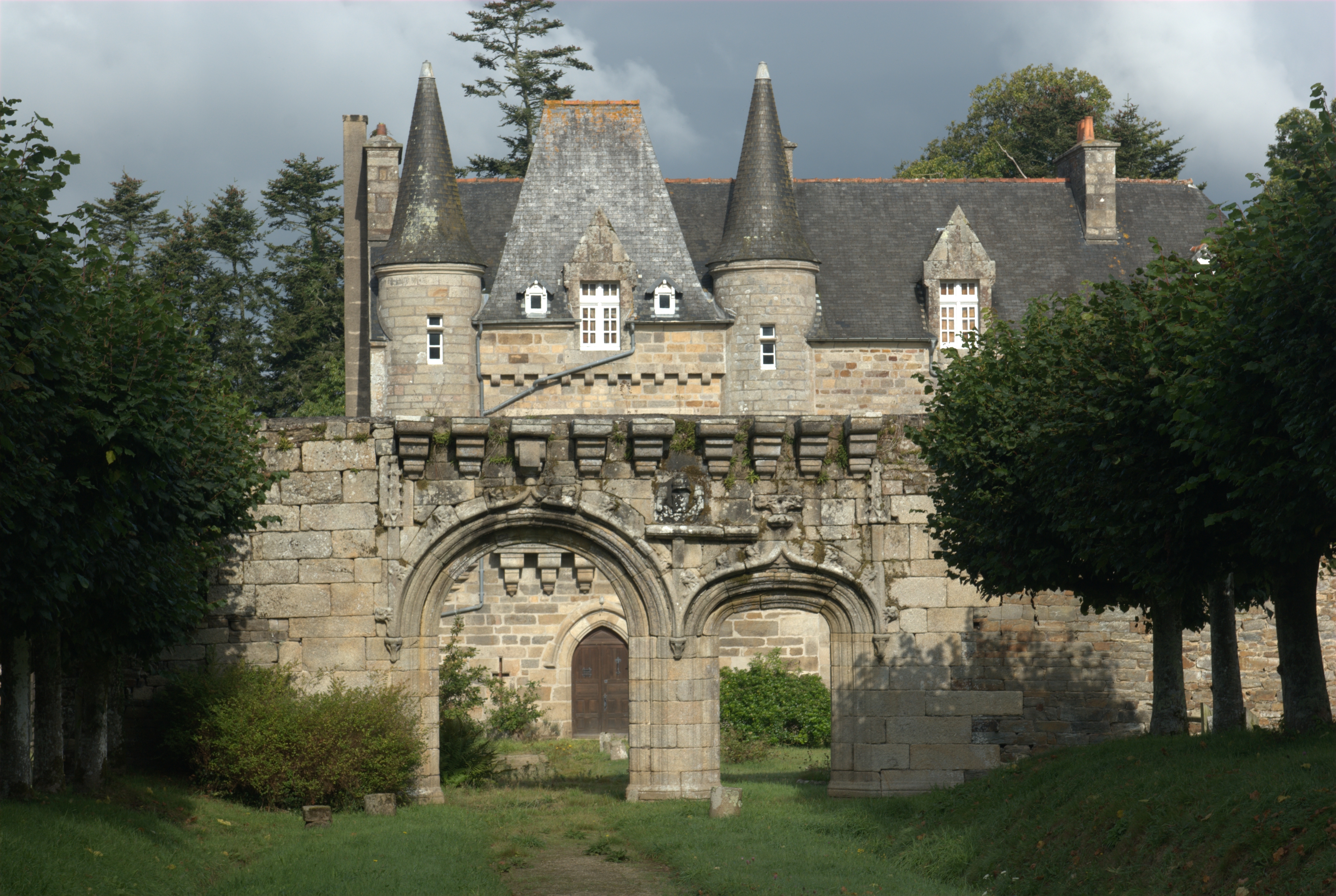 Trémel : manoir de Trébriant, vue générale depuis le sud-sud-est, photographie de 2009. Les portes charretière et piétonne (à arc surbaissé) étaient surmontées d'une galerie reposant sur des mâchicoulisImmatriculation