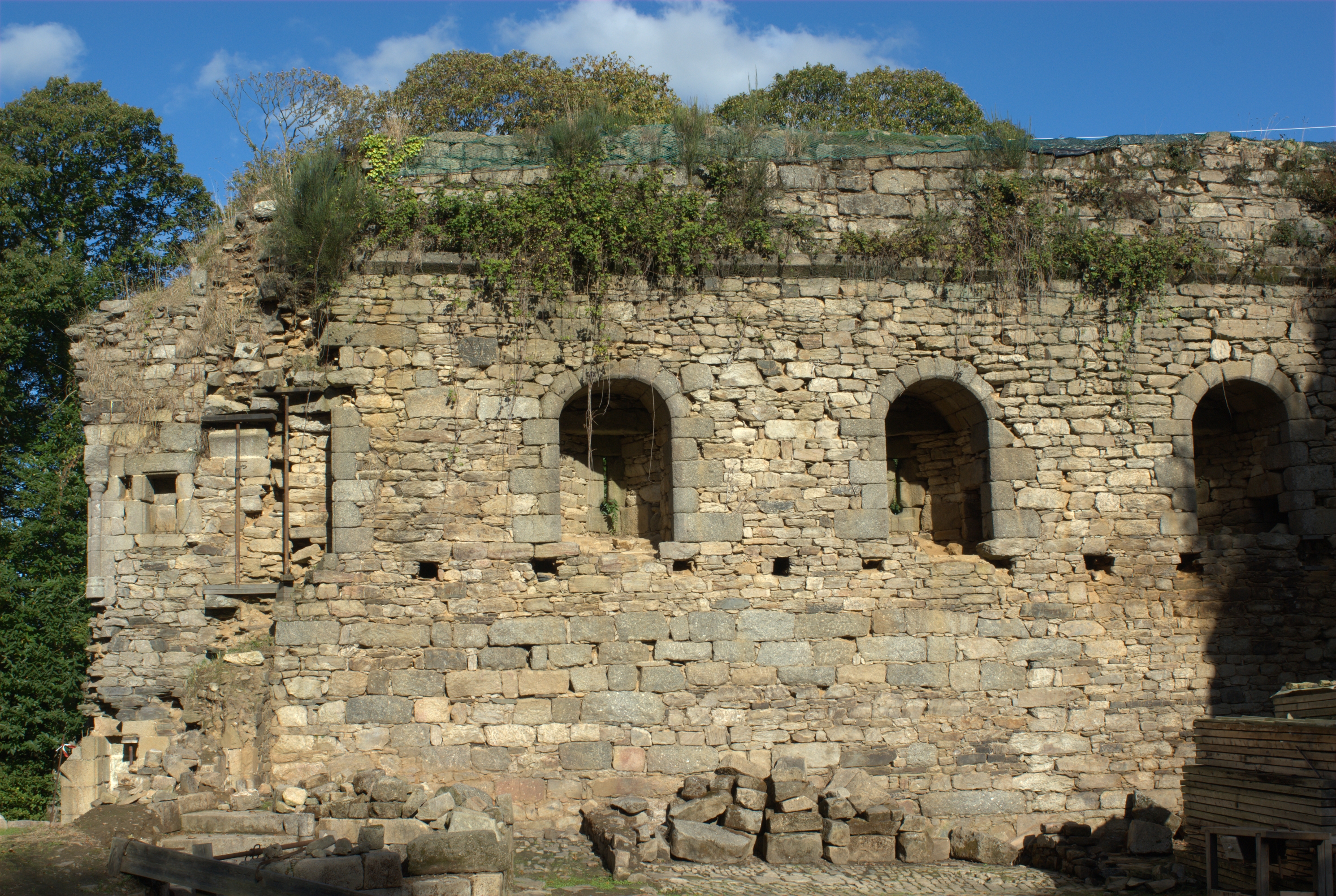 Vue de la courtine nord-est. Elle est percée d'une série de trois archères-canonnières. A gauche, les vestiges de deux cheminées du logis-porche - châtelet nordImmatriculation