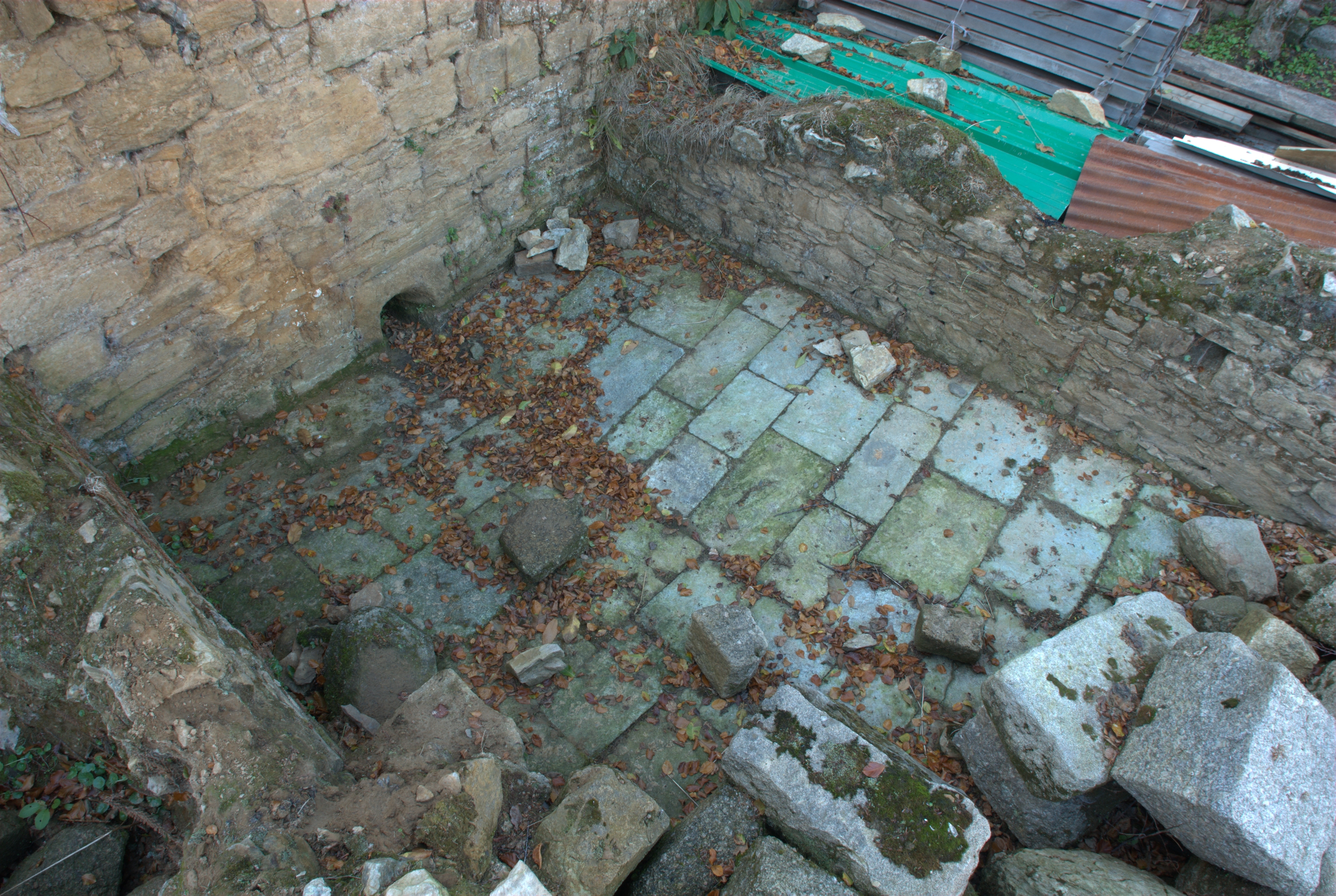 Vue intérieure du corps de bâtiment sud-ouest adossé contre la courtine : salle pavée et dotée d'un égout en rez-de-cour, il s'agit d'une souillarde (arrière-cuisine)Immatriculation