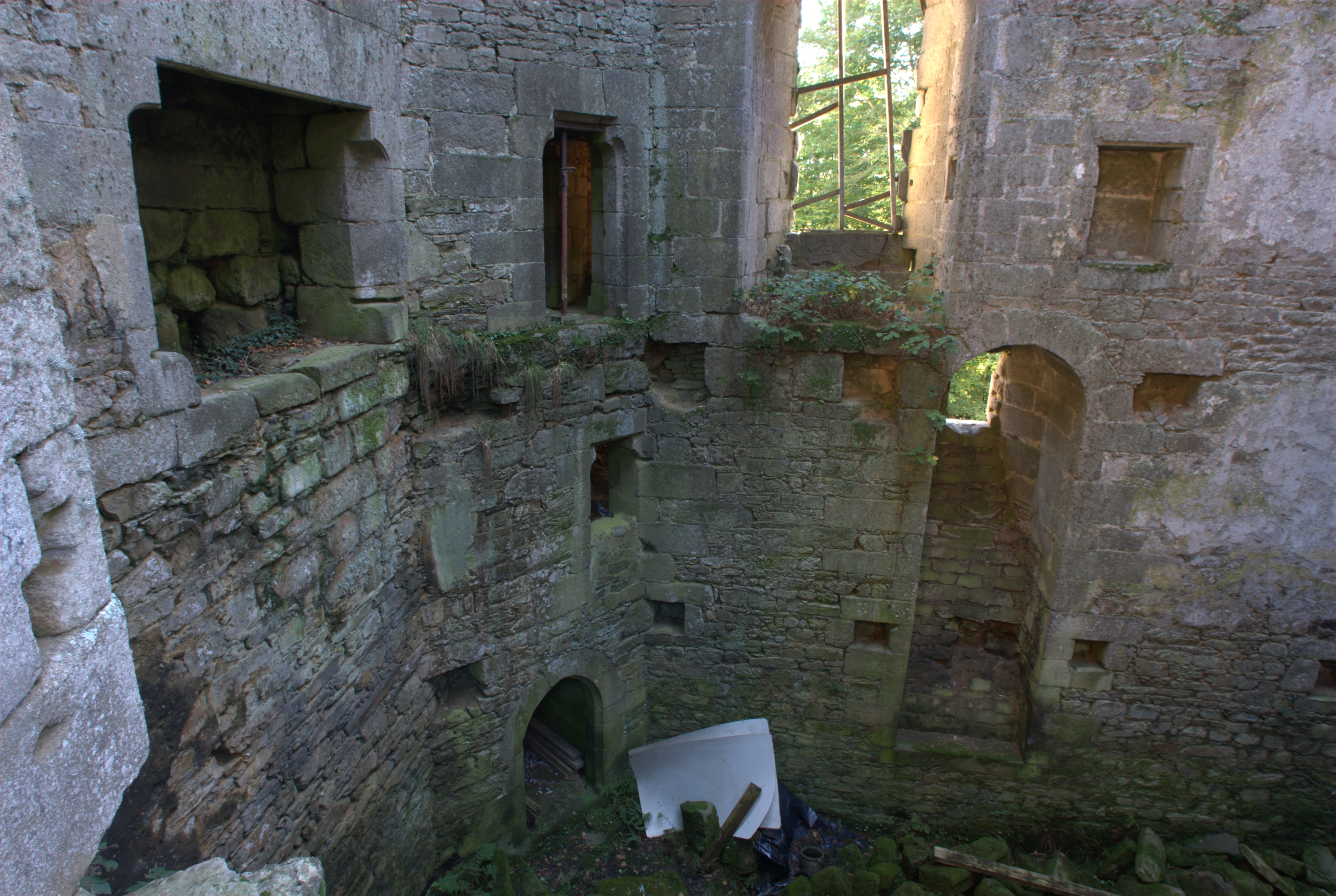 Vue intérieure du corps de bâtiment sud-est adossé à la courtine, extrémité est et tour d'angle au niveau du rez-de-chaussée (baies à coussiège, portes à linteau droit sur coussinet, cheminées, placards muraux et emplacement des poutres des planchers sont visibles)Immatriculation