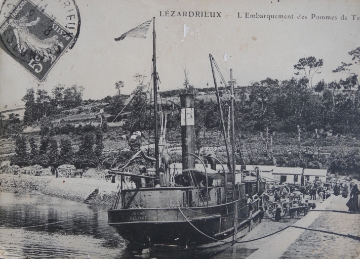 Vue des ouvrages portuaires de Lézardrieux, chargement d'un vapeur irlandais à la cale, début 20ème siècle (collection particulière, carte postale)Immatriculation