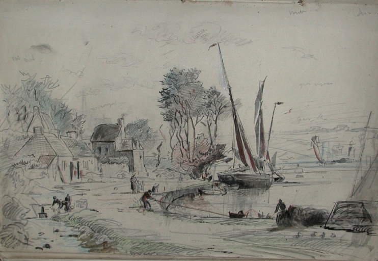 Dessin aquarellé de Faudacq : échouage d'un caboteur au niveau des anciens quais, près du lavoir du port, fin 19ème siècle (collection particulière)Immatriculation