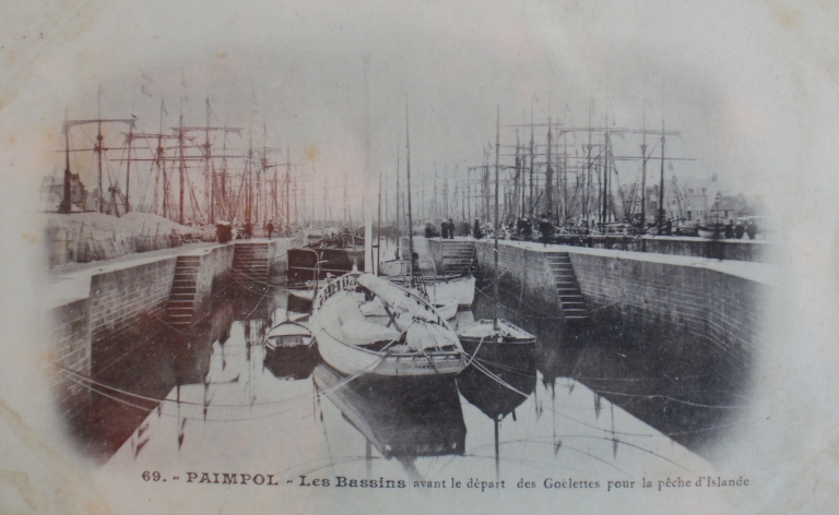 Vue de la cale de radoub, entre les bassins investis par les goélettes, 1er quart 20ème siècle (carte postale, collection particulière)Immatriculation