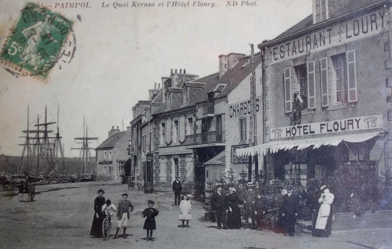 Le front de port de Kernoa, 1er quart 20ème siècle : commerce de bois, de ciment Poër et Hôtel Floury (carte postale, collection particulière)Immatriculation