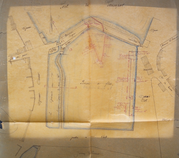 Vue des quais en construction au port de Paimpol, dans le cadre de l'aménagement du bassin à flot, englobant l'étang des deux moulins, 1877 (AD 22)Immatriculation