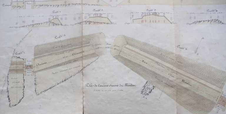 Plan : dessin de la digue, ancienne chaussée des moulins en 1882 (AD 22)Immatriculation