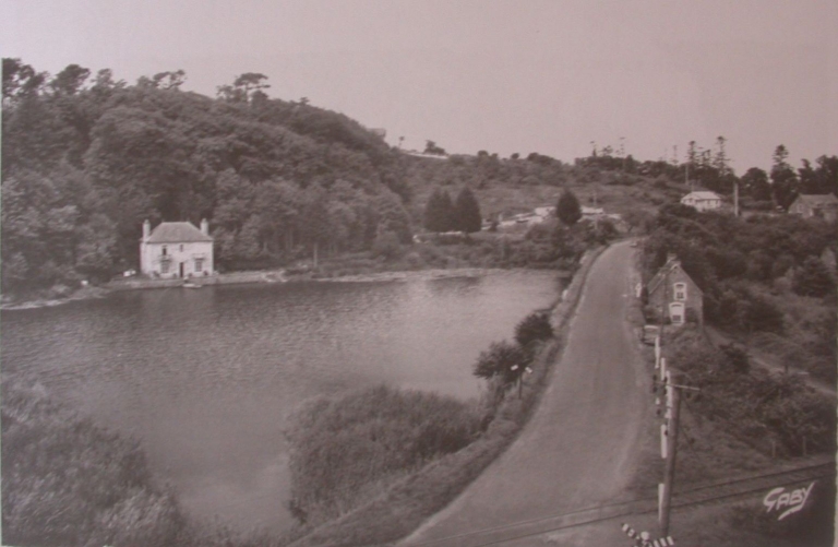 Vue de la voie après la passerelle, route de Plouézec, le moulin a disparu, vers 1948-50 (carte postale, collection particulière)Immatriculation