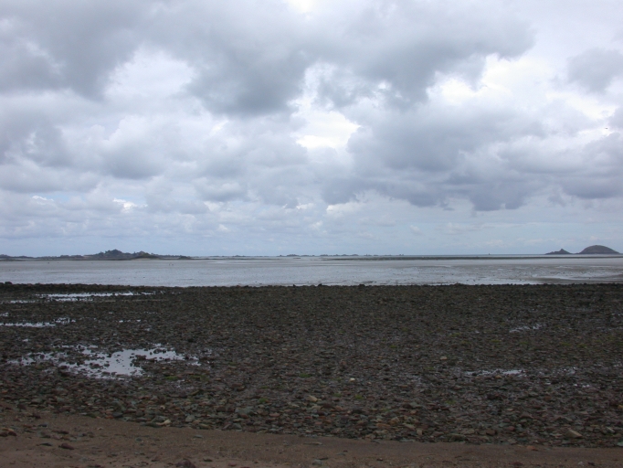 Vue des vestiges de la grande digue de Beauport à marée basseImmatriculation