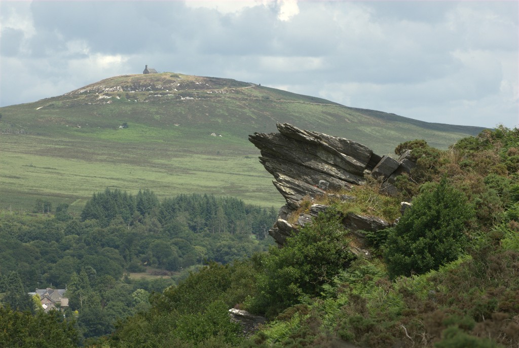 Vue du Mont Saint-Michel de Brasparts. La chapelle éponyme est un marqueur majeur de ce paysageImmatriculation