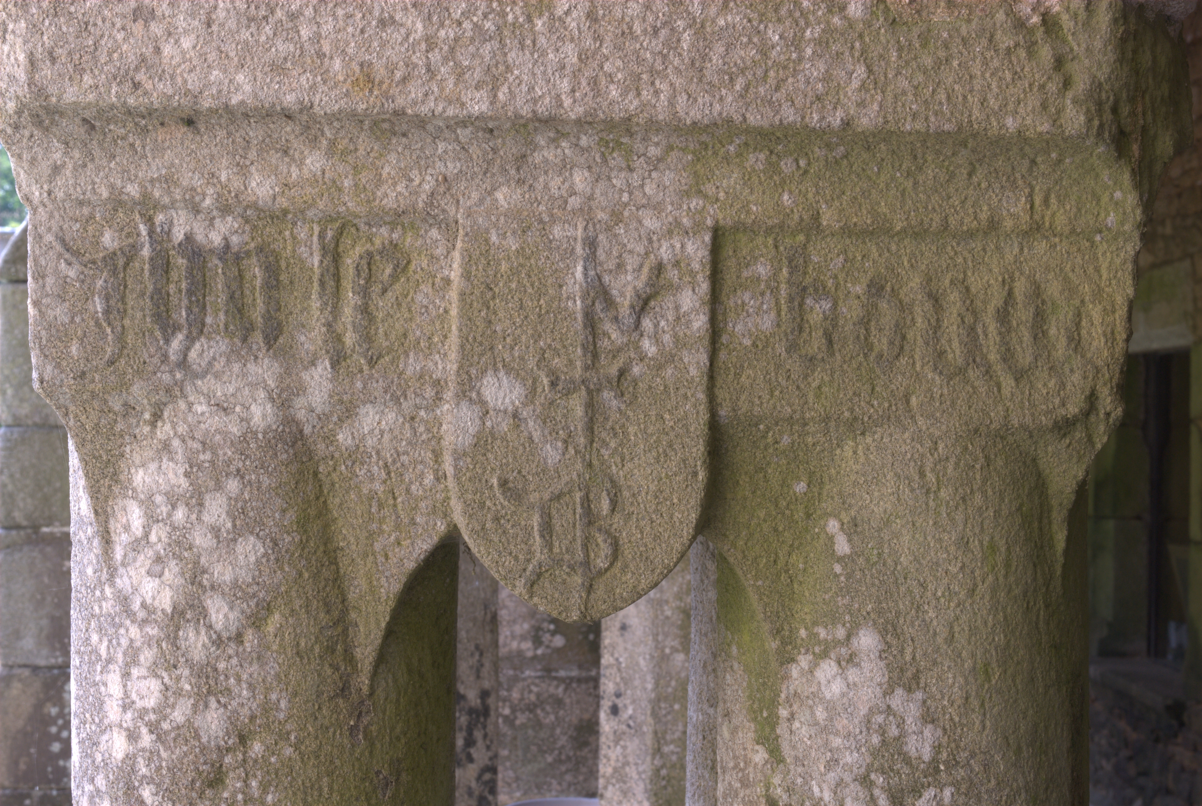 Vue des inscriptions gothiques et du blason dans le cloitreImmatriculation