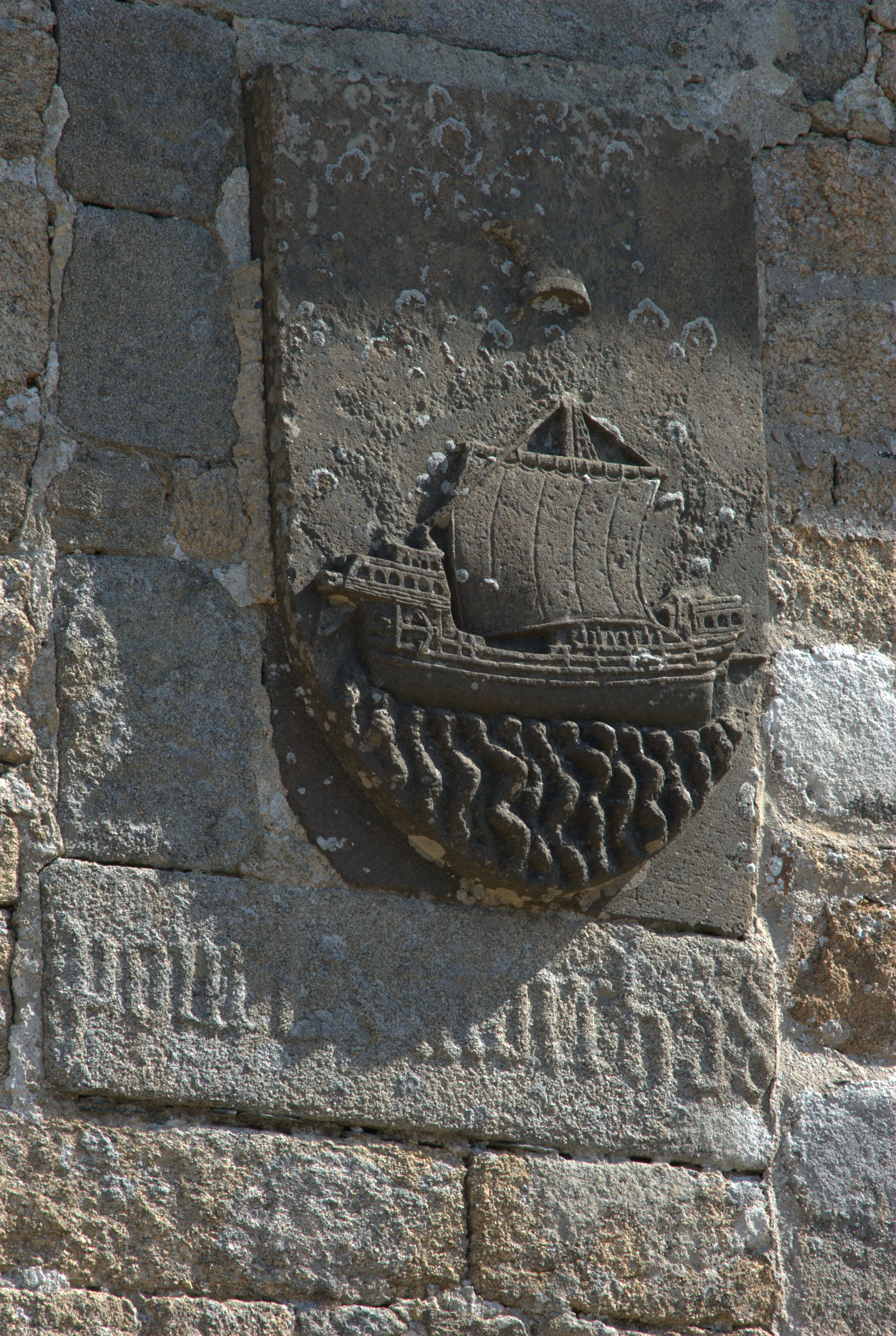 Vue de la pierre scuptée en kersanton représentant un bateau à voileImmatriculation