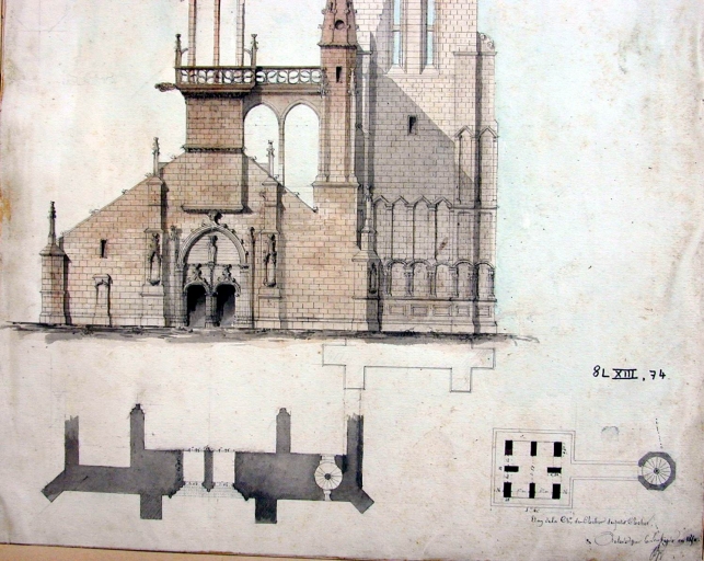 Elévation ouest de l'église, dessin par Joseph Bigot, 1860, vue partielle et plan (A. E. Quimper, fonds Bigot, 8 L XIII, 74)Immatriculation
