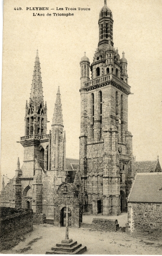 Les trois tours de l'église, l'arc monumental et la croix du sel, vue depuis le sud-ouest (fonds Villard, carte postale vers 1900)Immatriculation