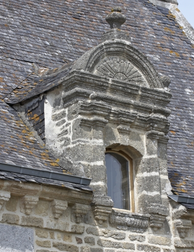 Détail : lucarne à fronton cintré, tympan avec décor gravé d'un soleilImmatriculation