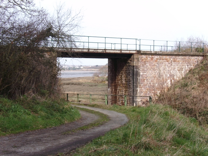 Vue générale sud-ouest du passage inférieur de Traou-Du : ouvrage à tablier métallique contruit en pierre de taille de granite à ton clair et moellons de grès rose équarris polygonauxImmatriculation
