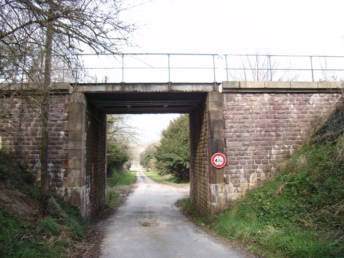 Vue générale sud du passage inférieur de Pont-Dervan : ouvrage à tablier métallique contruit en pierre de taille de granite à ton clair et moellons de grès rose équarris polygonauxImmatriculation