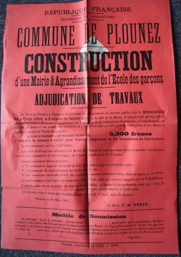 Annonce par voie d'affichage public de l'adjudication des travaux à entreprendre pour la construction d'une mairie et l'agrandissement de l'école des Garçons de Plounez, 1906 (AD 22)Immatriculation
