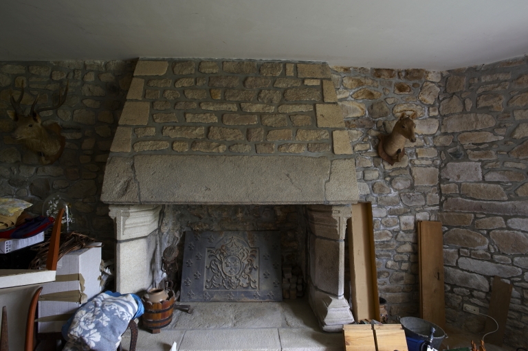 Cheminée de la salle remontée. Les piedroits en avancés proviennent d'une cheminée d'étage.Immatriculation