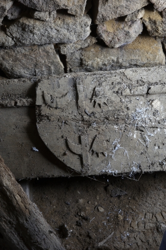 Poutre déposée ornée d'un blason mi-parti, dont l'un appartient à la famille Kerpunce, l'autre est non identifié.Immatriculation