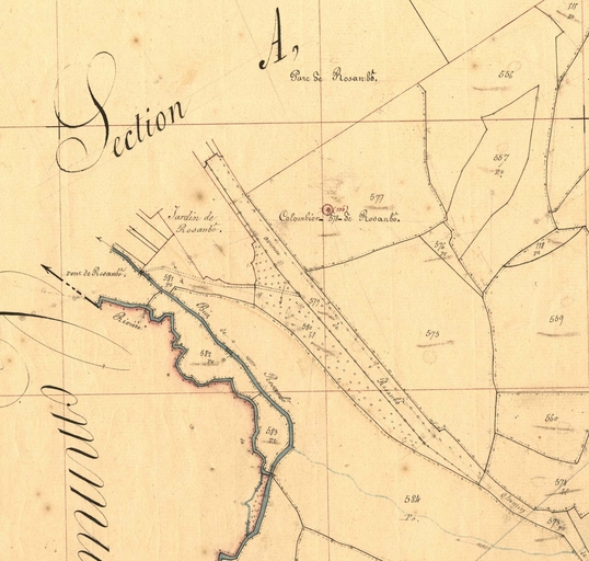 Extrait du cadastre de la commune de Lanvellec, 1848 : avenue et colombier de RosanboImmatriculation