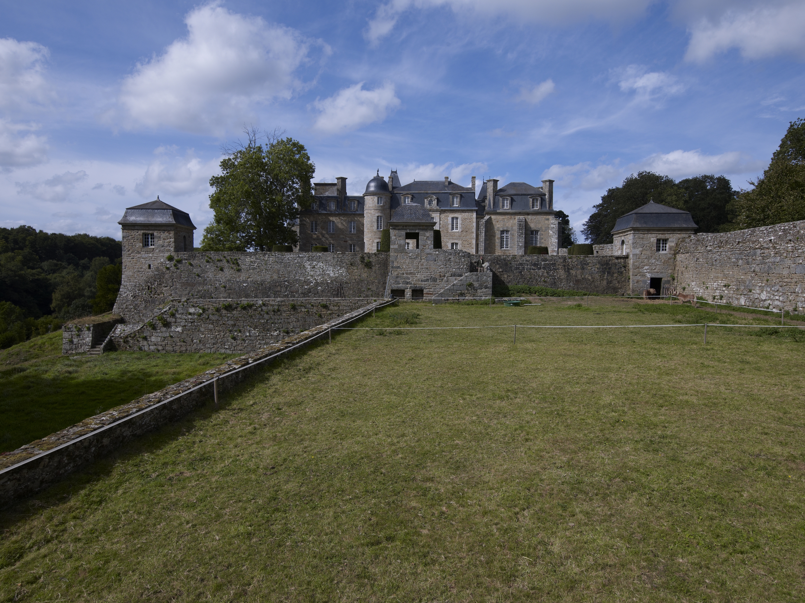 Vue de l'élévation orientée vers le sud-est depuis la terrasse inférieure. Les trois pavillons de jardin rythment le mur de clôtureImmatriculation