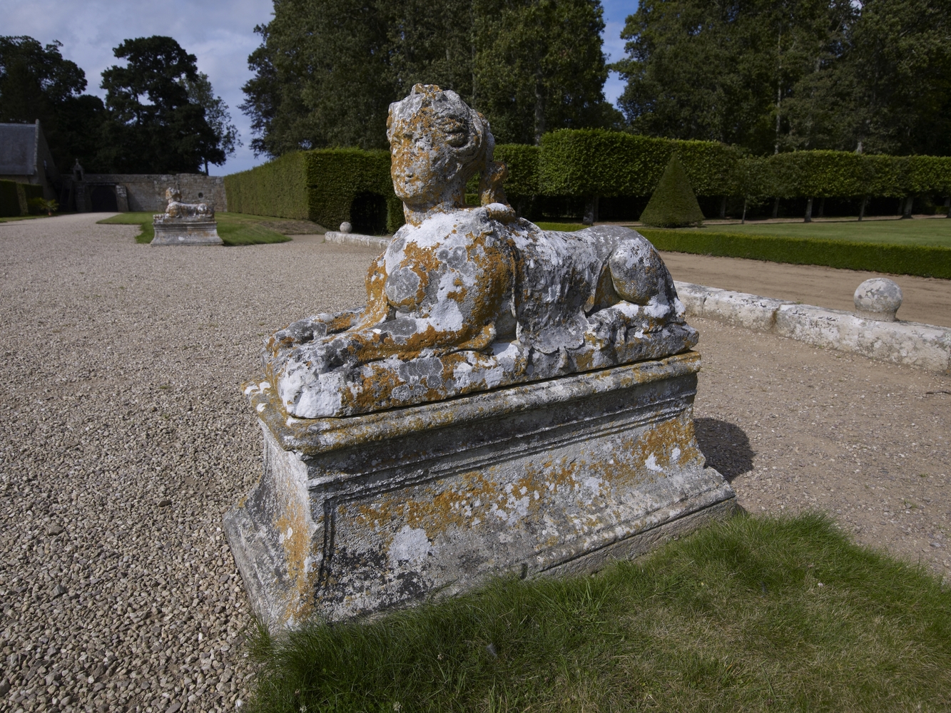 Vue de l'une des statues de sphynx (tête de femme, corps de lion et ailes d'oiseau)Immatriculation