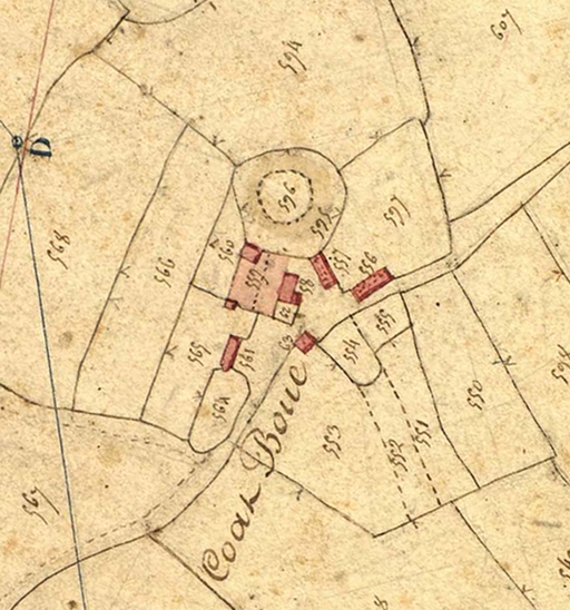 Extrait du cadastre ancien de la commune de Plouaret, 1835 : Coat Boue (Coat Roué). On distingue une motte féodaleImmatriculation