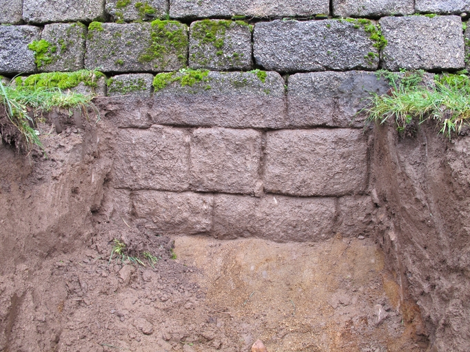 Vue des sondages archéologiques au pied de la courtine de la basse-cour (Service régional de l'archéologie, Yves Roumegoux, 16 février 2011)Immatriculation