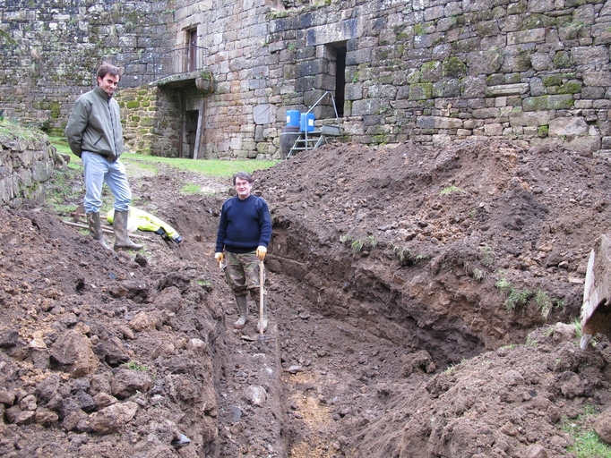 Vue des sondages archéologiques dans la basse-cour : vestiges d'une barbacane ? (Service régional de l'archéologie, Yves Roumegoux, 16 février 2011)Immatriculation