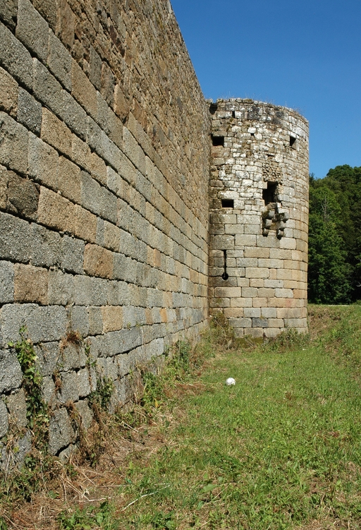 Vue de la barbacane. La courtine est flanquée par les ouvertures de tir de la tour (archère-canonnière et embrasures)Immatriculation