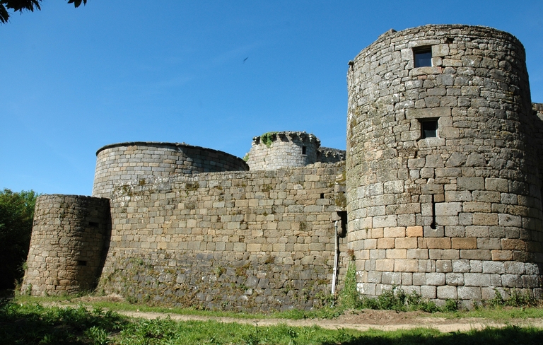 Vue de la barbacane alternant courtine et tours de plan circulaire. A droite : ouverture de tir (archère-canonnière) surmontée de deux baiesImmatriculation