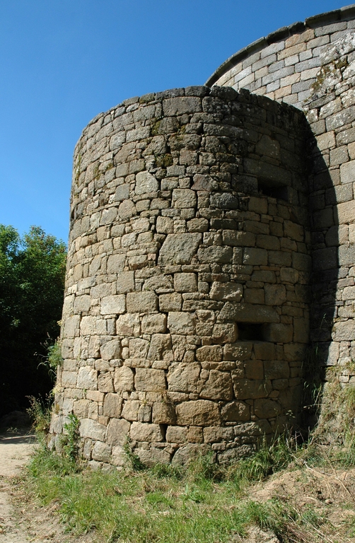 Vue de la barbacane : tour ouest de plan circulaire percée de deux niveaux d'embrasure flanquant la courtineImmatriculation