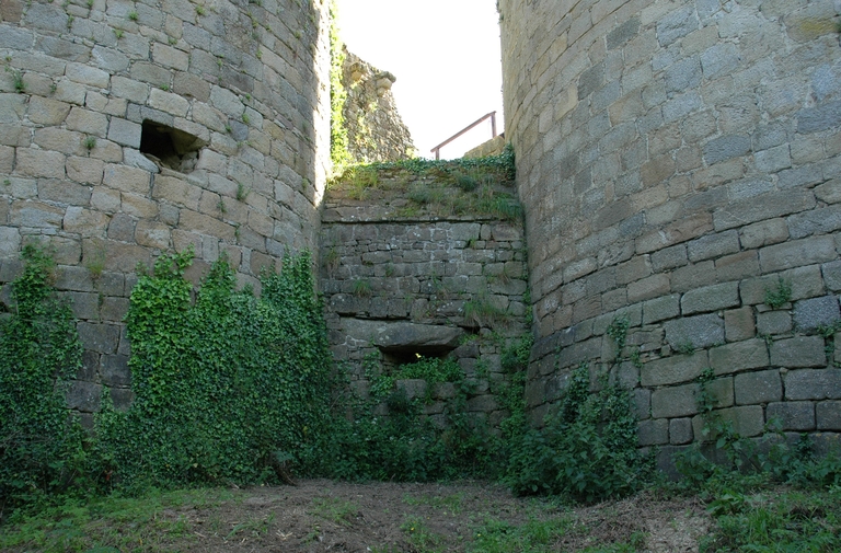 Vue de la courtine située entre la tour nord-est (à gauche) et la tour dite dite tour de Rougé (à droite). Elle est percée d'une embrasureImmatriculation