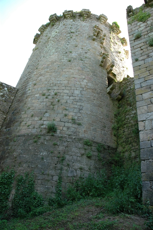 Vue de la tour d'Acigné en contre-plongée. Les consoles des trois latrines en encorbellement de la tour subistent ; au sommet de la tour se voient des mâchicoulis de type bretonImmatriculation