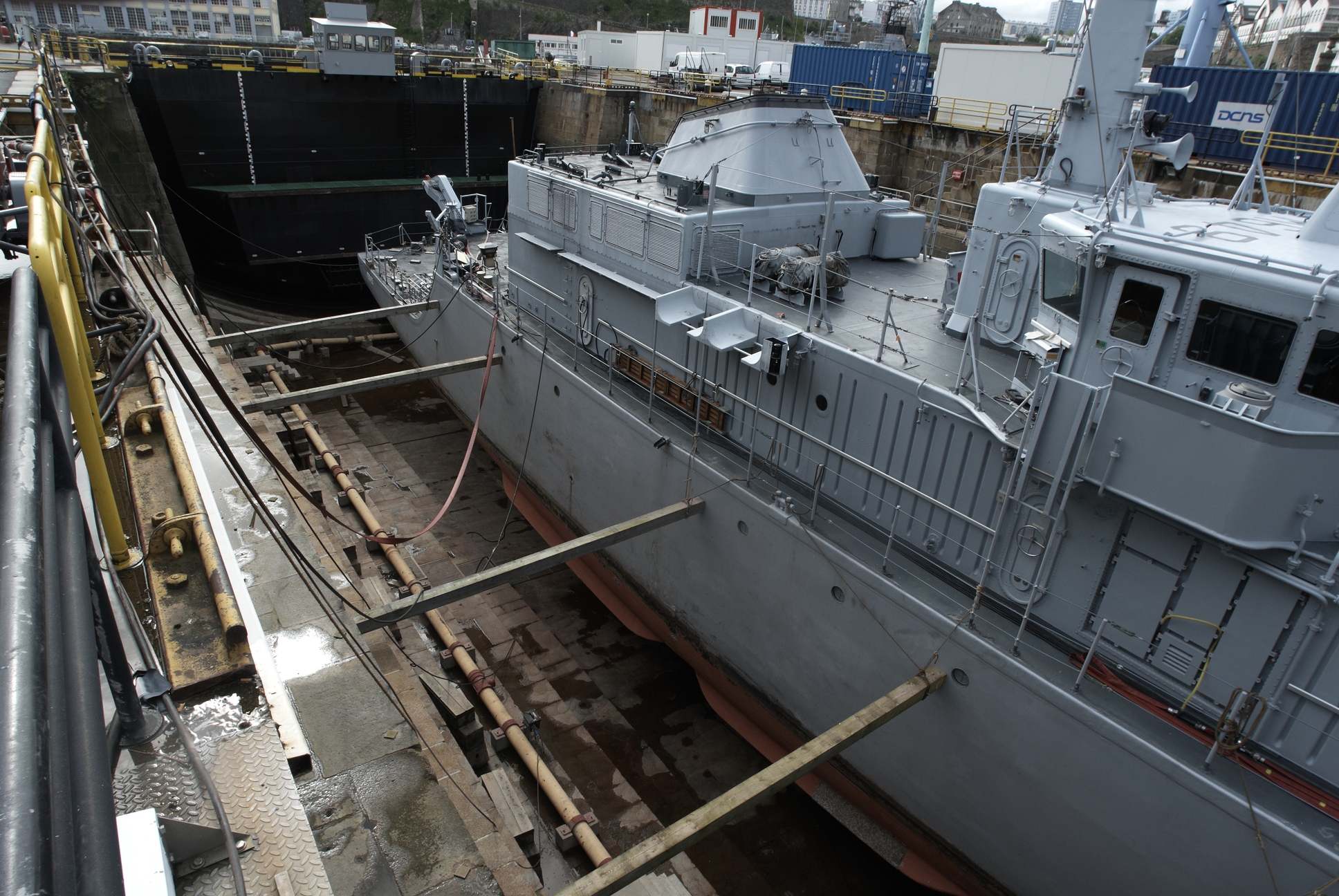 Brest, dans l´enceinte de l´arsenal : forme de Troulan actuellement bassin n° 1 dit bassin Tourville. Le navire Persée, immatriculé M 649, est un des 13 chasseurs de mines français du type tripartite (CMT)Immatriculation