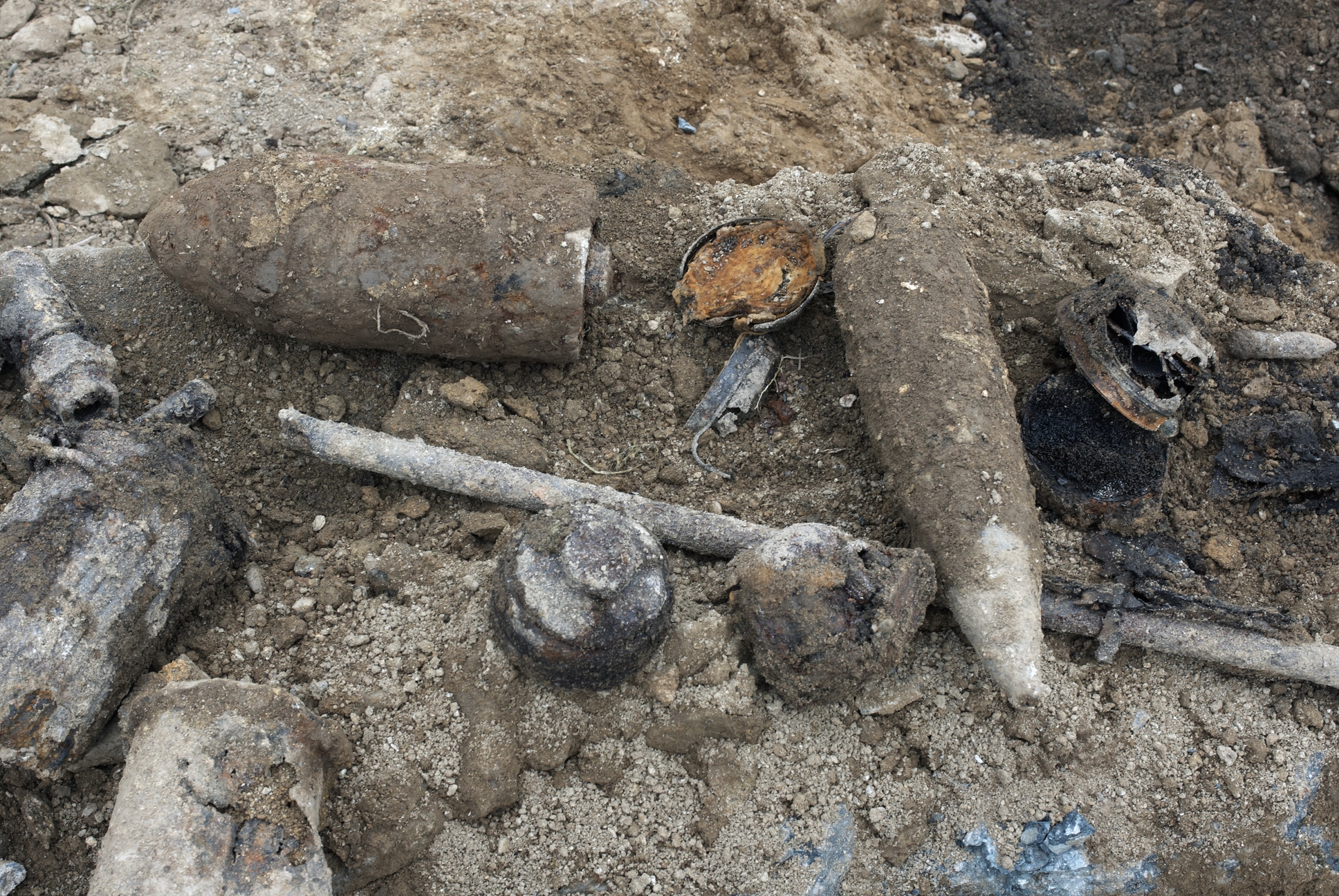 Objets et matériels pyrotechniques (obus de différents types, gargousses, cartouches et étuis de masque à gaz...) découverts lors de la déconstruction des bunkersImmatriculation