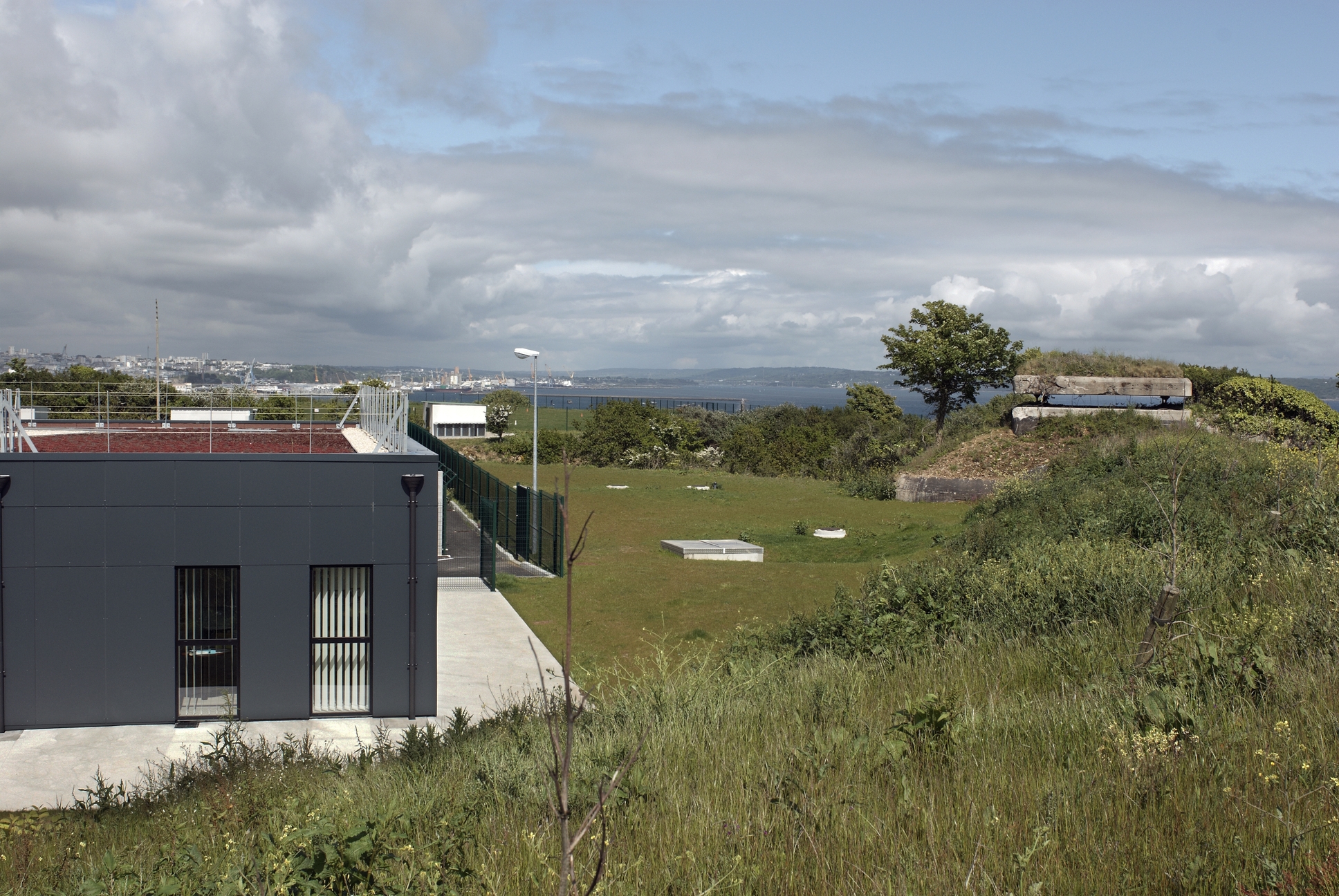 Vue de situation du bunker-poste de direction de tir de type M157 et du chenil du Portzic (dans l'emprise militaire). En arrière-plan : la ville de BrestImmatriculation