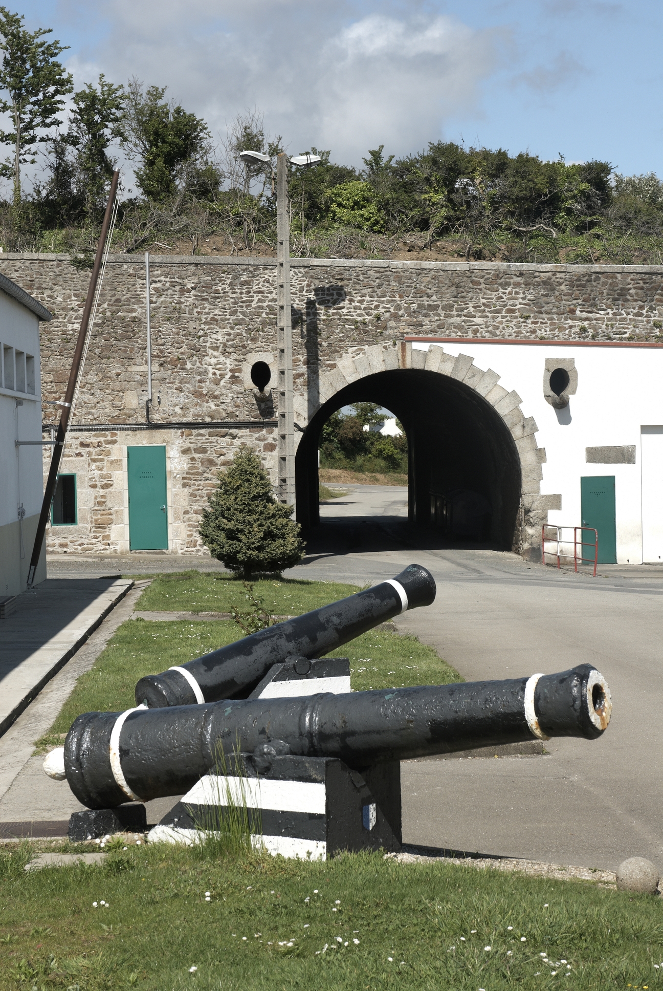 Vue du casernement du fort du Portzic avec passage d'entrée (dans l'emprise militaire). Au premier plan : deux pièces d'artillerieImmatriculation