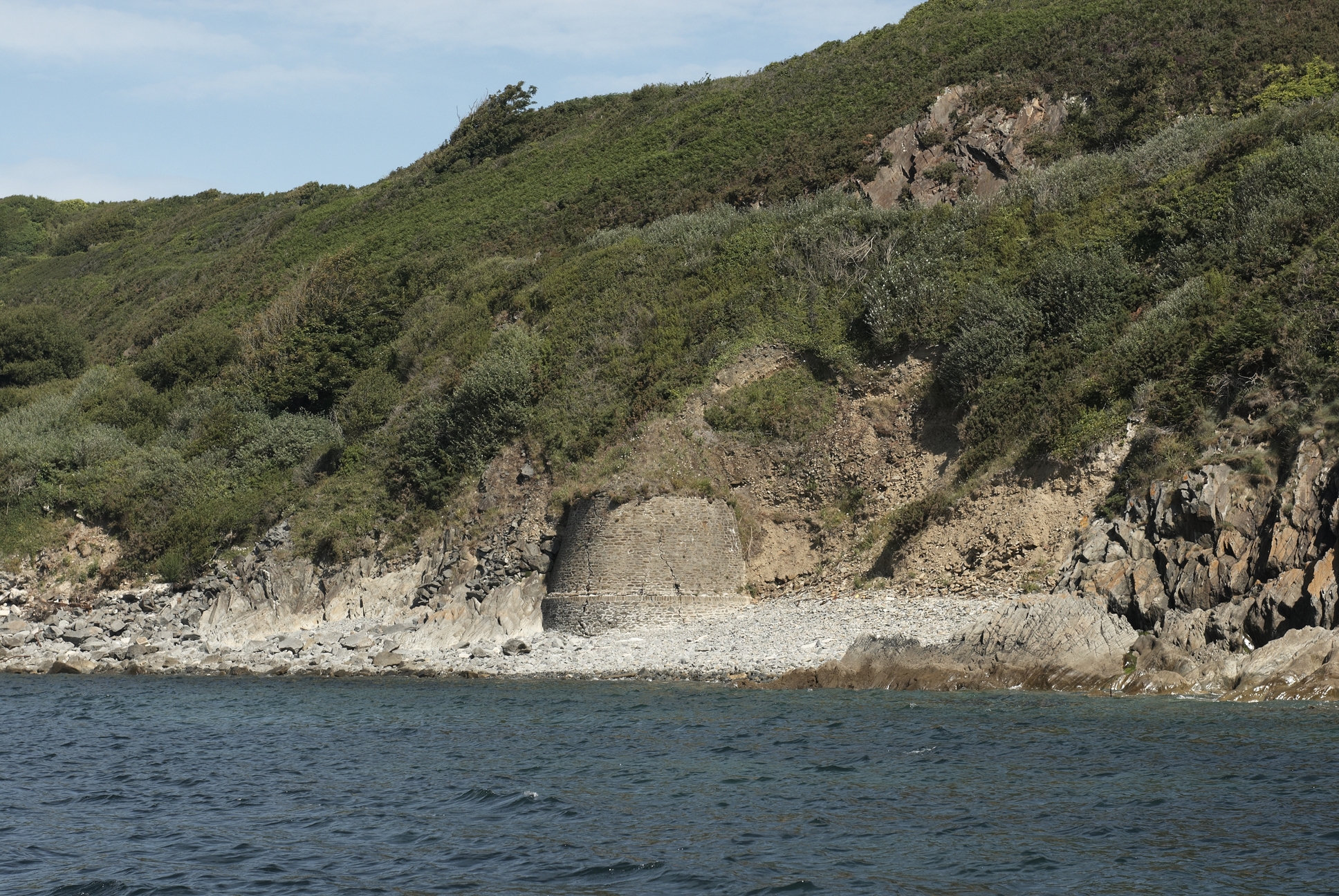 Vue de situation depuis la mer : les embrasures se trouvaient à droite du massif de maçonnerie (état en 2009)Immatriculation