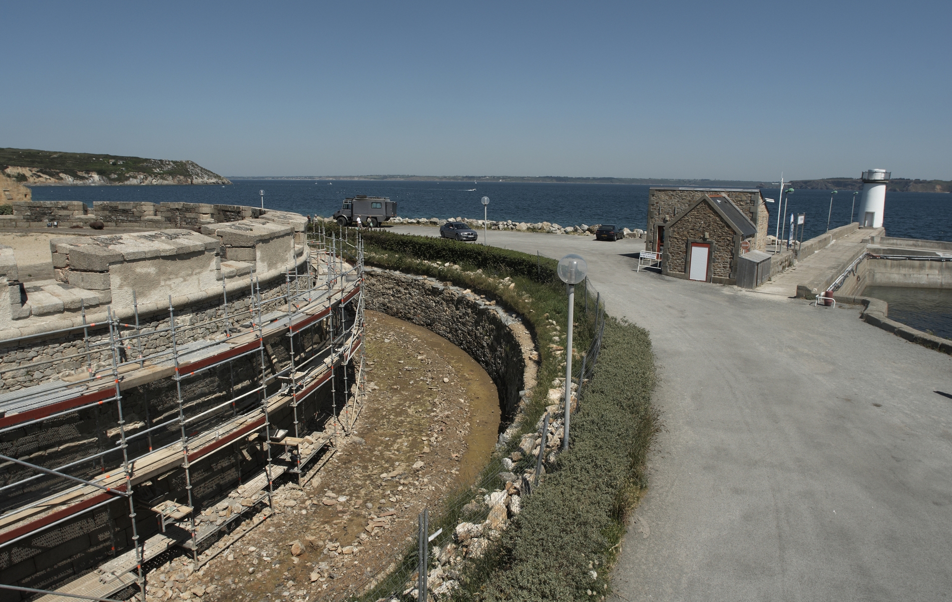 Camaret-sur-Mer : vue de la tour Vauban, restauration de l'escarpe de la batterieImmatriculation