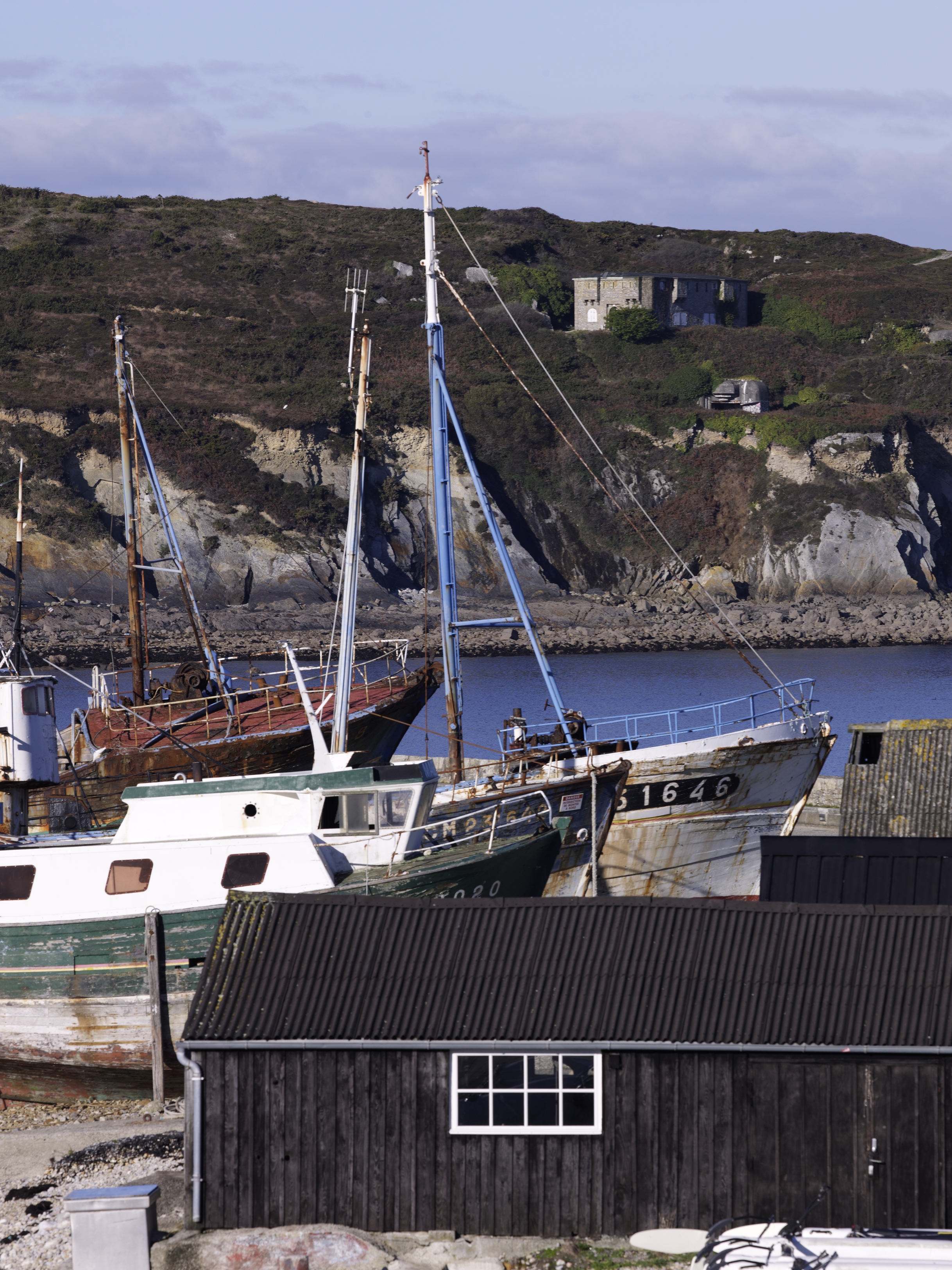 Camaret-sur-Mer : vue de l'une des deux cabanes de la tour Vauban. En arrière plan : le cimetière de bateaux du sillon et la pointe du GouinImmatriculation