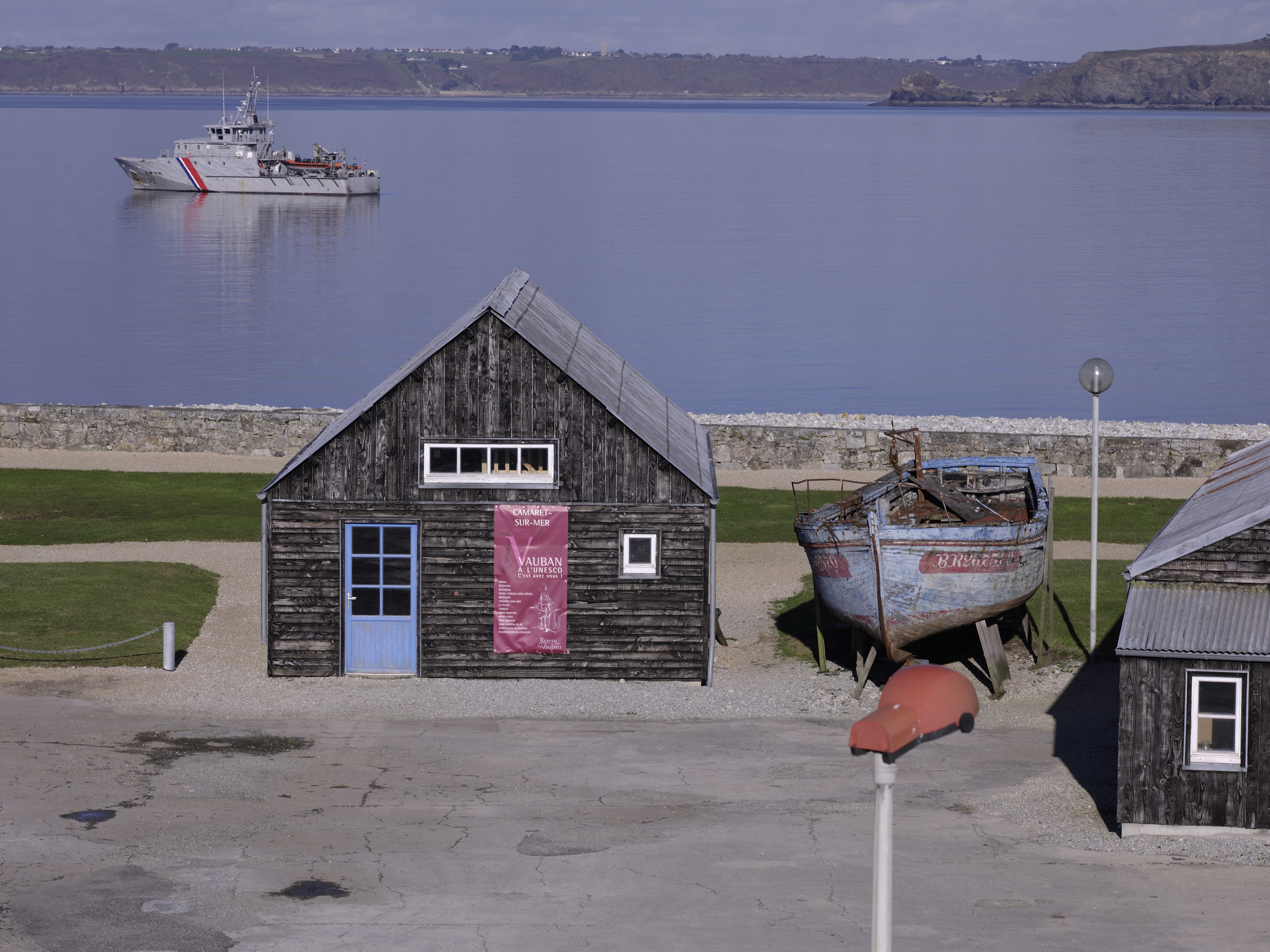 Camaret-sur-Mer : vue de l'une des deux cabanes de la tour Vauban. En arrière plan : l'ilot des Capucin et le fort du MengantImmatriculation