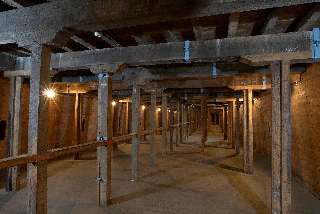 Vue intérieure de la poudrière n° 2 (P2) de la vallée de Kerhuon : rez-de-chaussée vers l'ouest, poteaux et poutres soutenant les voliges du plancher du premier étage (état en 2009). Des poteaux ont été ajoutés ; certaines poutres ont été cercléesImmatriculation