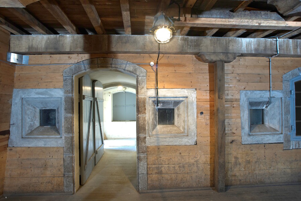 Vue intérieure de la poudrière n° 2 (P2) de la vallée de Kerhuon : rez-de-chaussée, extrémité est, porte donnant sur le sas (état en 2009). De part et d'autre, des créneaux à lampeImmatriculation