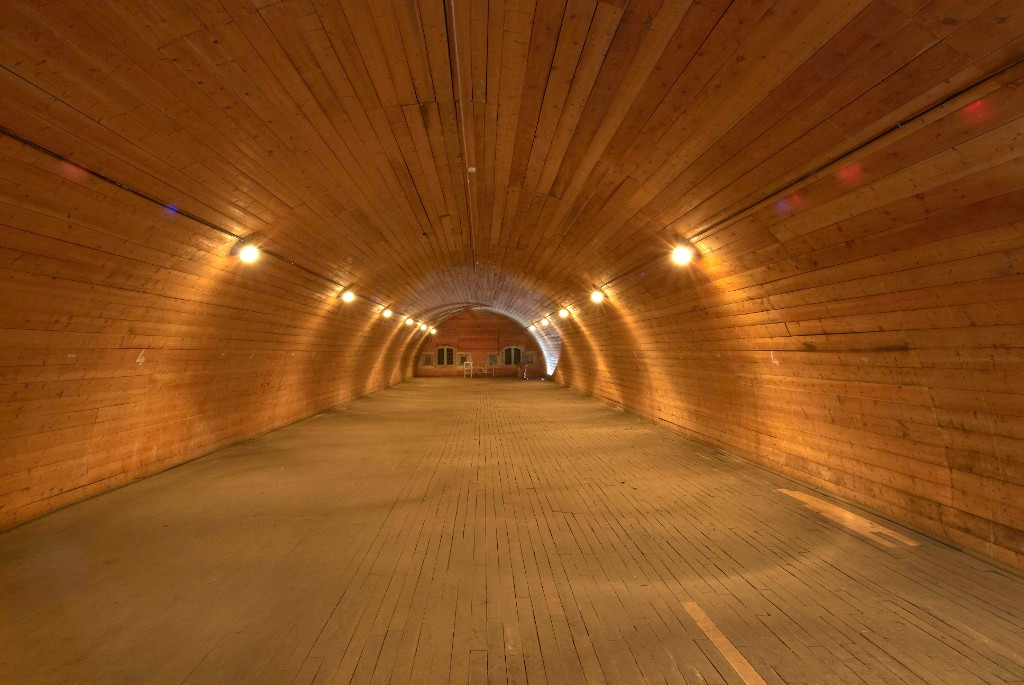 Vue intérieure de la poudrière n° 2 (P2) de la vallée de Kerhuon : premier étage voûté en pierre sous voûte lambrissée vers l'ouest (état en 2009)Immatriculation